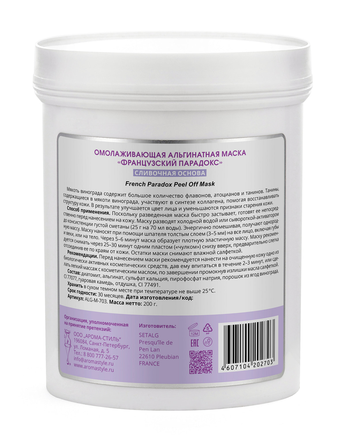 В результате применения альгинатной маски «Французский парадокс» улучшается цвет лица и уменьшаются признаки старения кожи.