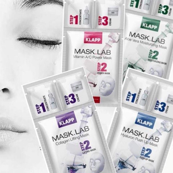Mask.Lab - трехшаговый набор экспресс-ухода от Klapp из сыворотки, маски и крема, который в кратчайшие сроки вернет уставшей коже ухоженный и свежий вид. Маски хорошо увлажняют, питают и подтягивают кожный покров, устраняют мелкие морщины, освежают и улучшают цвет лица.